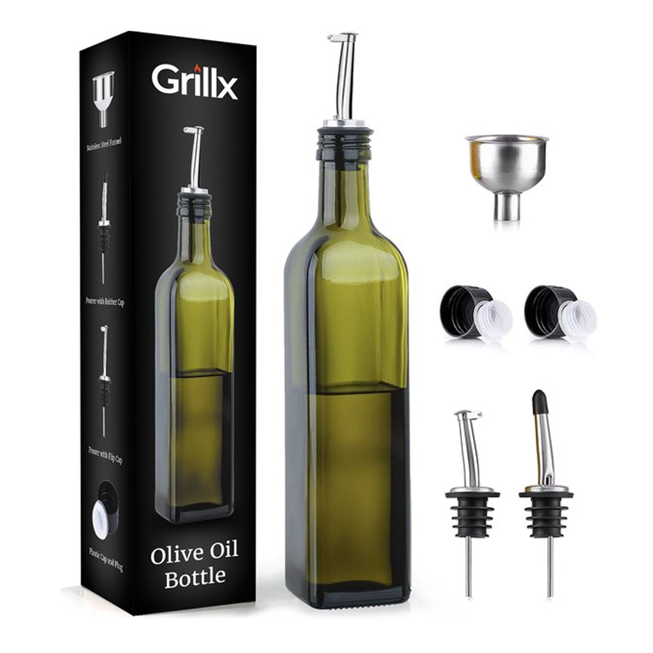 De olijfolie fles van GrillX word geleverd inclusief meerdere accessoires: twee schenktuiten, een trechter en twee afsluitdoppen. Door middel van de trechter is het kinderlijk eenvoudig om olijfolie in de fles te schenken. Hiermee voorkom je knoeien en vieze handen. Met de schenktuiten kun je eenvoudig olie doseren bij het uitschenken. Met behulp van de aflsluitdoppen kun je de olie erg lang bewaren en blijft het lang houdbaar.